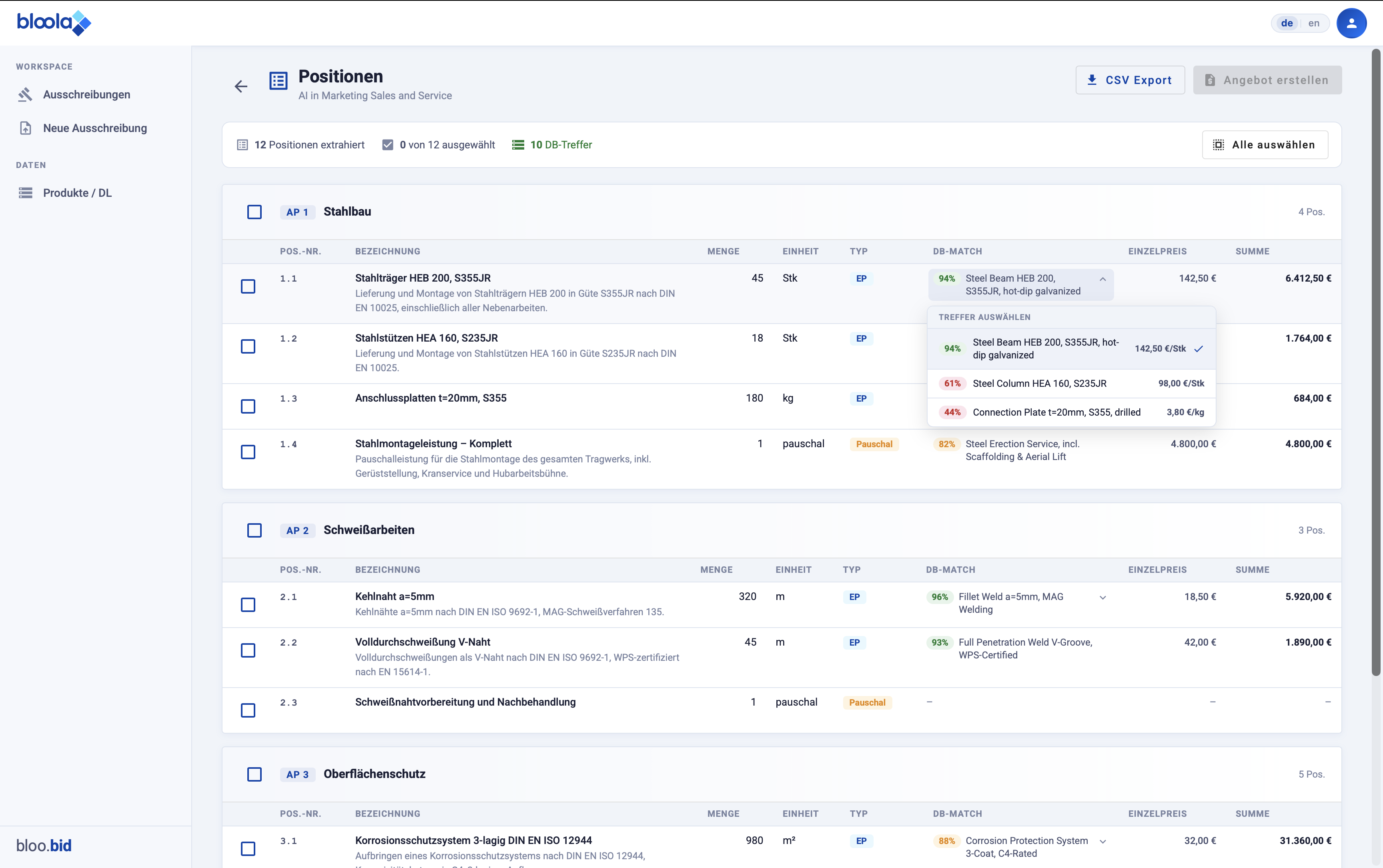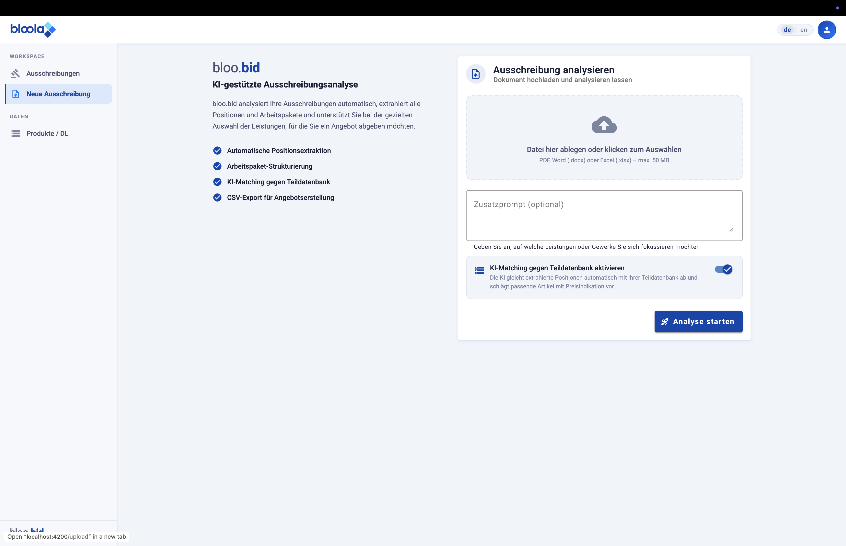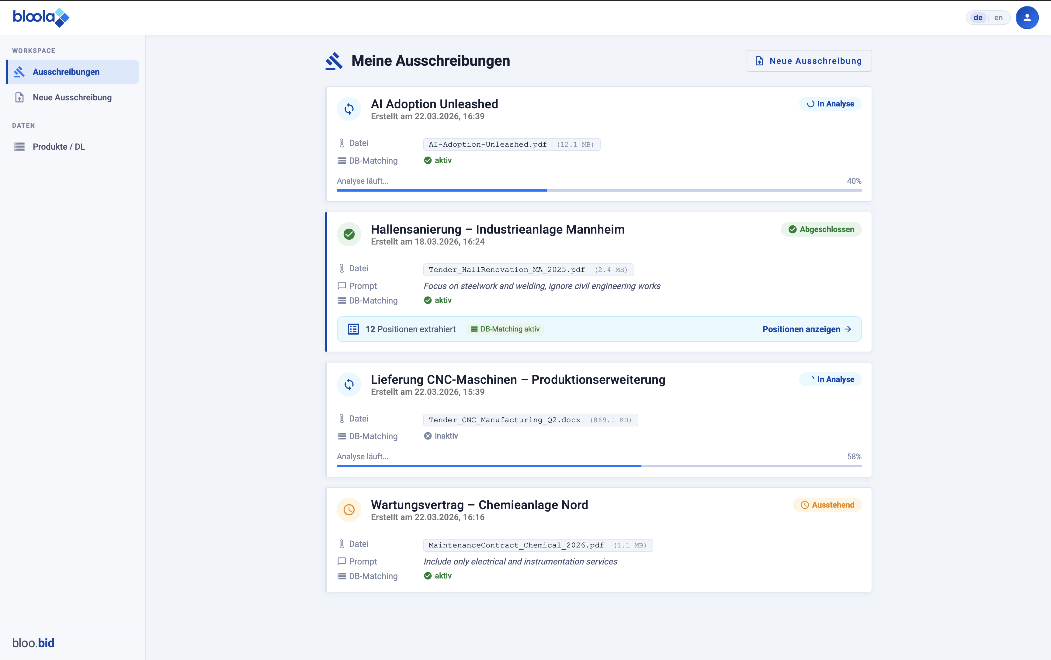 Mit bloo.bid digitalisieren und automatisieren Sie die zentralen Schritte der Ausschreibungsbearbeitung in einem System. Vom Dokumentenupload über die Analyse bis zur Zuordnung passender Produkte und Dienstleistungen. So entsteht ein klarer, strukturierter Prozess statt manueller Einzelschritte.
