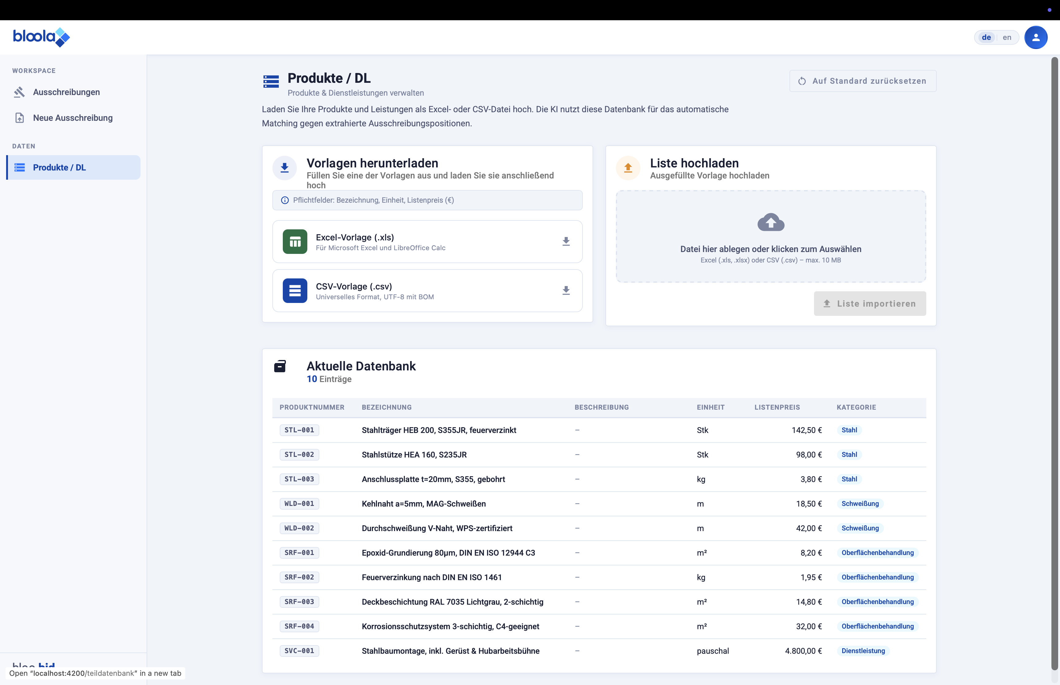 Absolut. Du kannst deine eigenen CSV- oder Excel-Kataloge mit deinen Netto-Preisen hochladen. Die KI matcht die Ausschreibungstexte direkt mit deinem spezifischen Sortiment.
